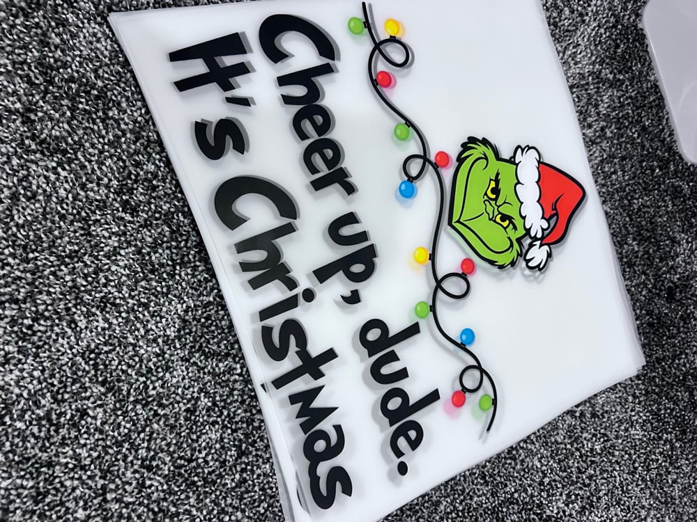 Dtf heat transfer Christmas theme for matching t shirts and hoodies cheer up dude grinch